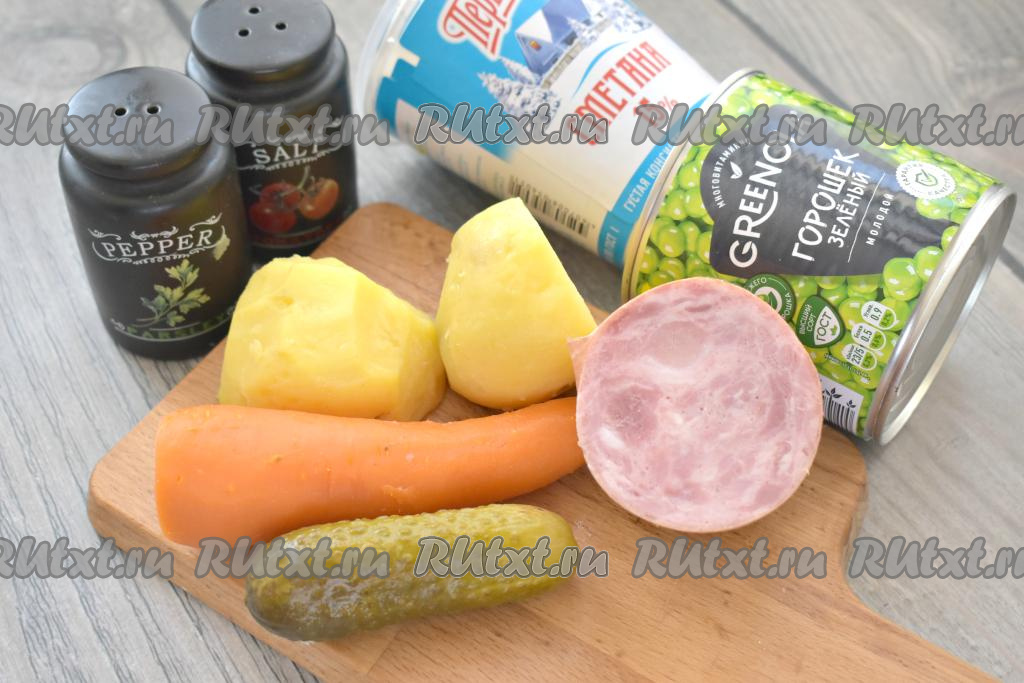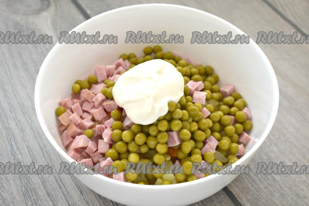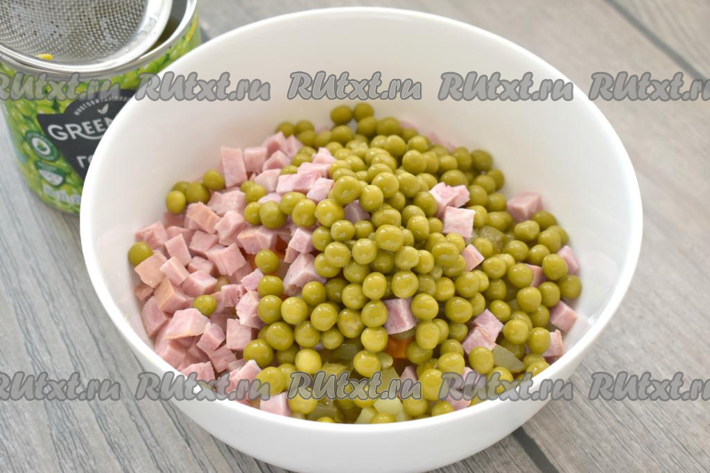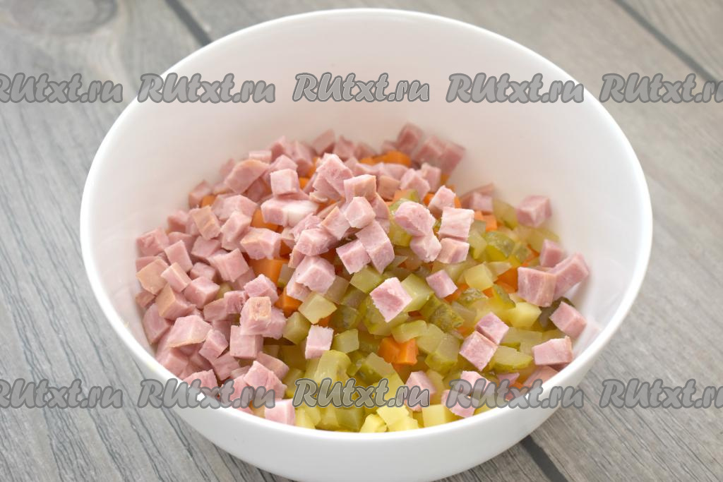 Варёную колбасу (или ветчину) тоже нарезаем на маленькие кубики, добавляем в салат. Старайтесь, чтобы все овощи и колбаса были нарезаны на кубики одинакового размера, тогда "Оливье" получится особенно вкусным.