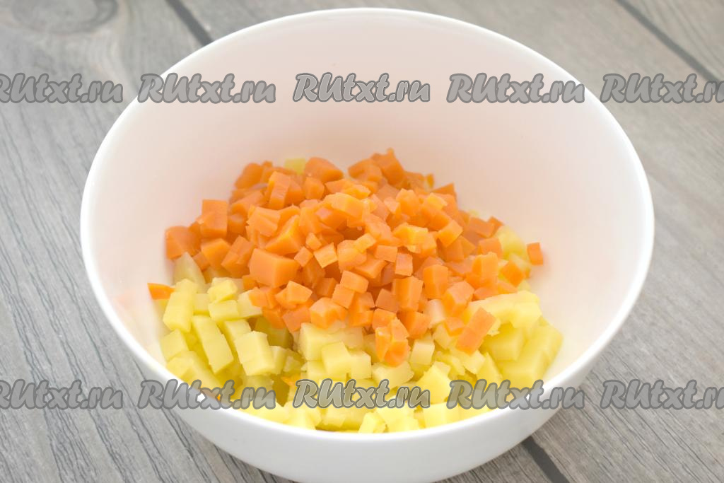 Морковку нарезаем на маленькие кубики такого же размера, как нарезана и картошка, добавляем в миску.