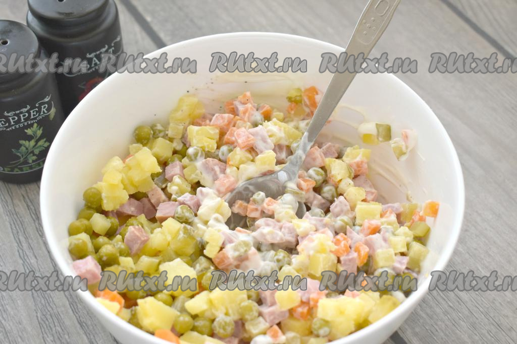 Перемешиваем салат Оливье, приготовленный без яиц, перчим его и солим.