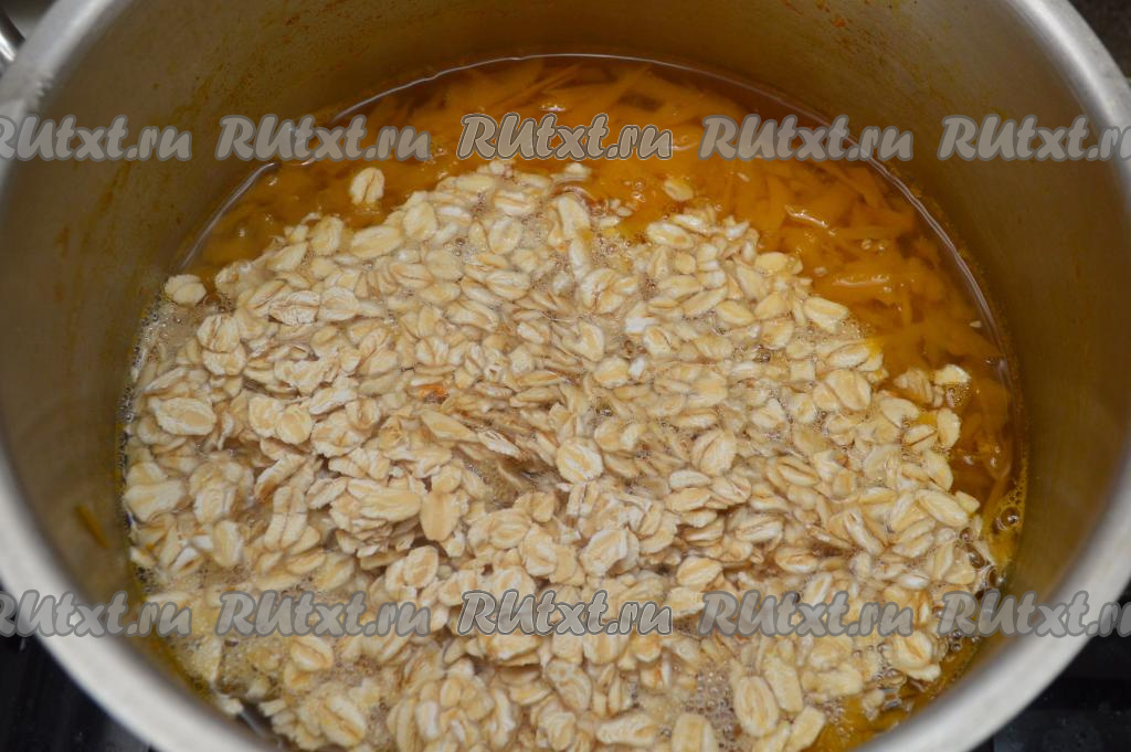 Всыпьте овсянку в кастрюлю с тыквой, перемешайте и варите на медленном огне в течение 5 минут.