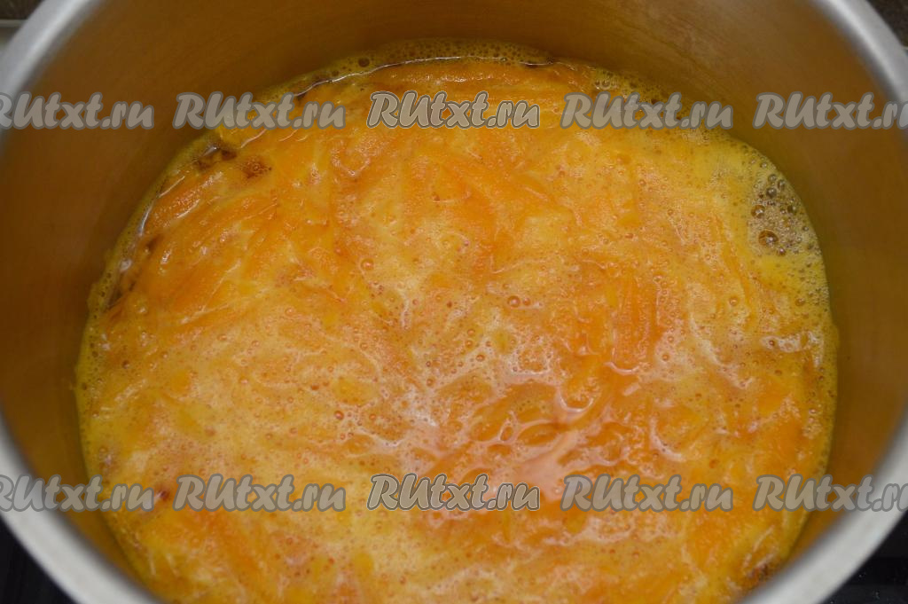 Очистите тыкву от кожуры, удалите волокна с семечками. Натрите 200 грамм очищенной тыквы на крупной тёрке.