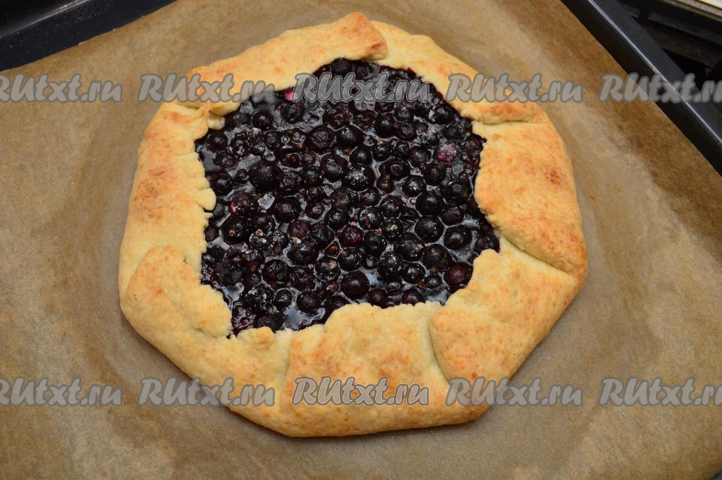 Переложить бумагу с раскатанным тестом на противень. Выложить в центр теста начинку из чёрной смородины. Завернуть края теста на начинку, сформировав открытую галету, как на фото.