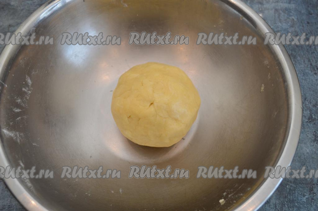 Добавить 2 столовых ложки холодной воды в миску и начать замес песочного теста руками. Песочное тесто должно скататься в шар. У меня после добавления 2 столовых ложек тесто плохо собиралось в шар, поэтому я добавила ещё 1 столовую ложку холодной воды и вмешала её в тесто. Тесто должно получиться немного липнущим к рукам. Накрыть миску с тестом и отправить в холодильник на 30 минут.