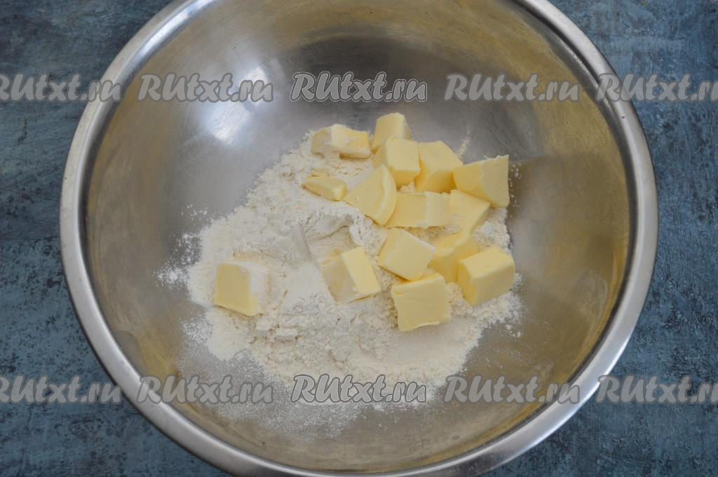 Для замешивания песочного теста нужно в миску всыпать муку, сахар и щепотку соли, добавить холодное сливочное масло, нарезанное на кубики.