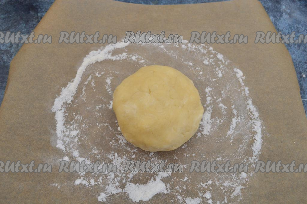 По прошествии получаса достать тесто для галеты из холодильника. Бумагу для выпечки немного припылить мукой. Выложить в середину колобок из теста.
