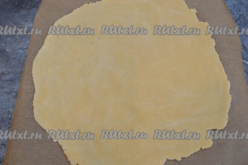 Размять тесто сначала руками в лепёшку, а затем раскатать скалкой до толщины 2-3 миллиметра.