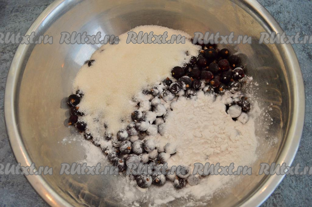 В отдельной миске соединить размороженную чёрную смородину, с которой слили лишний сок (или обсушенные свежие ягоды), сахар и крахмал, хорошо перемешать, стараясь не мять ягодки. Если крахмал плохо смешается со смородиной, то он, во-первых, не так хорошо будет желировать ягоды во время выпечки, а, во-вторых, в готовой выпечке будет слегка поскрипывать на зубах.