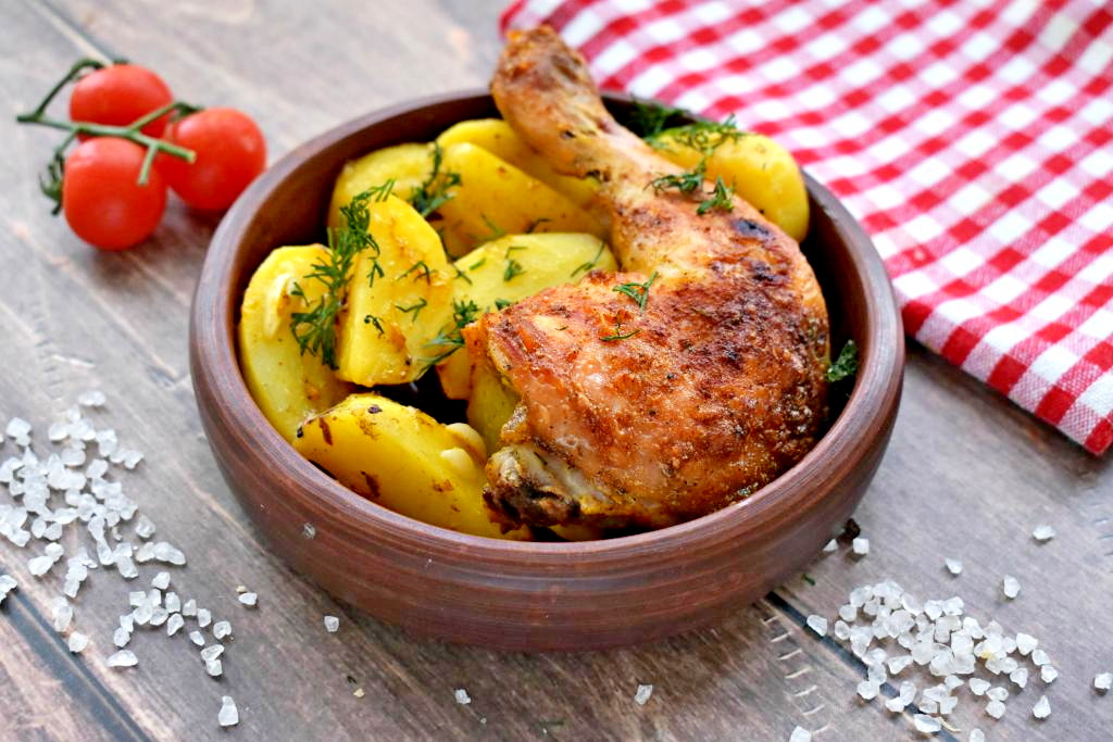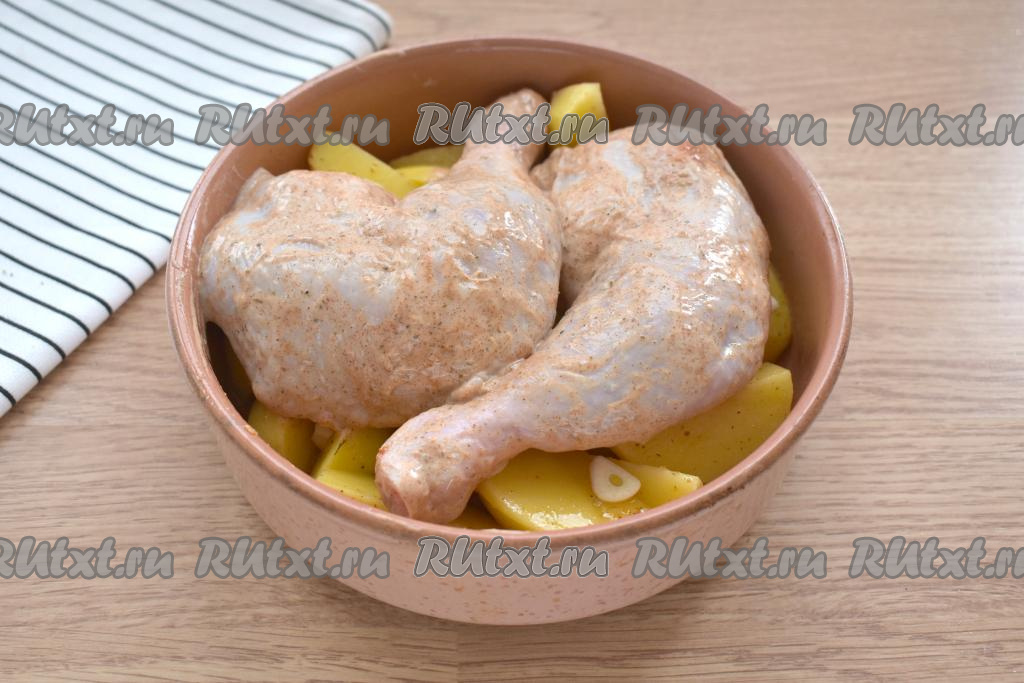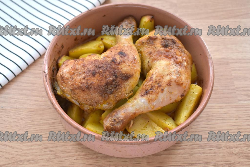 Запекаем куриные окорочка с картошкой в разогретой духовке минут 60 при температуре 180 градусов. Картофель в процессе запекания должен стать мягким, легко протыкаться ножом. Продолжительность приготовления картофеля во многом зависит от толщины нарезки и сорта картошки. Куриные окорочка в процессе запекания покроются золотистой корочкой.