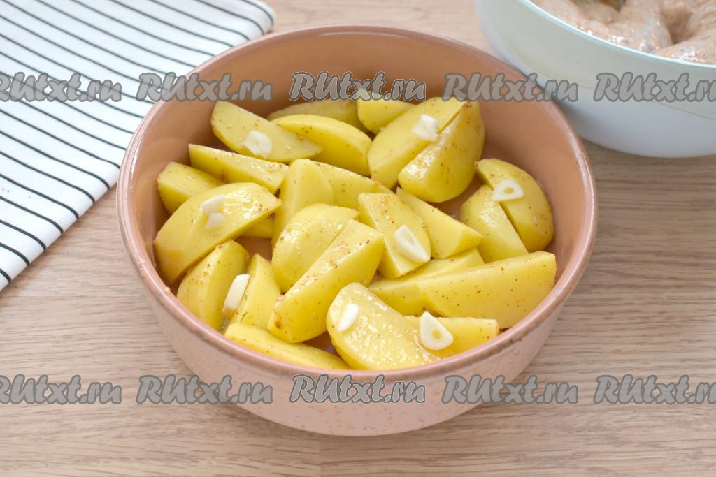 Перемешиваем картофель со специями и маслом, затем перекладываем в жаропрочную форму. Сверху на картошку кладём очищенные зубчики чеснока, нарезанные на пластины.