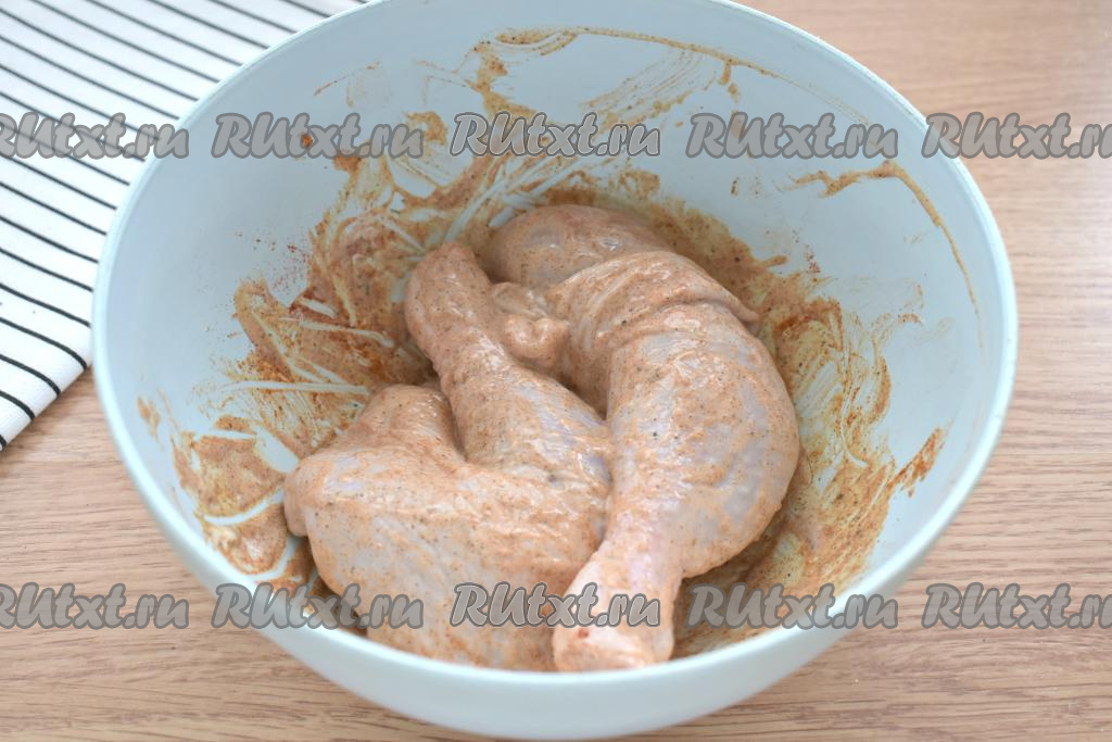 Перемешиваем, тщательно покрывая окорочка сметаной, горчицей и специями со всех сторон.