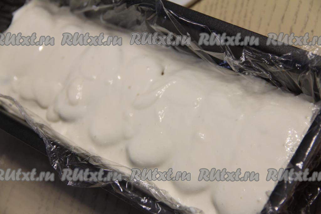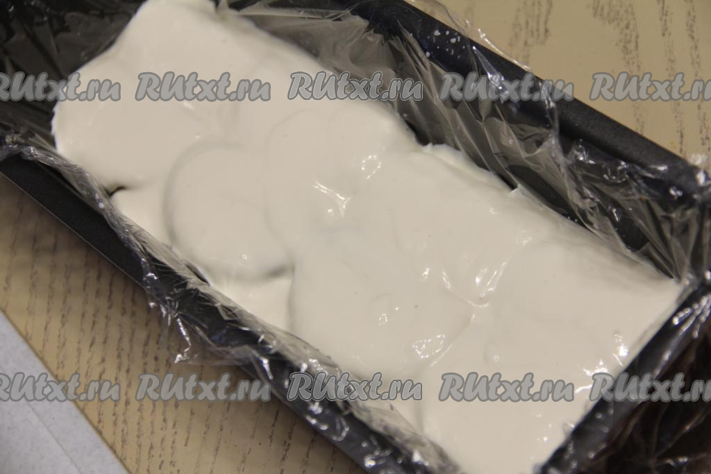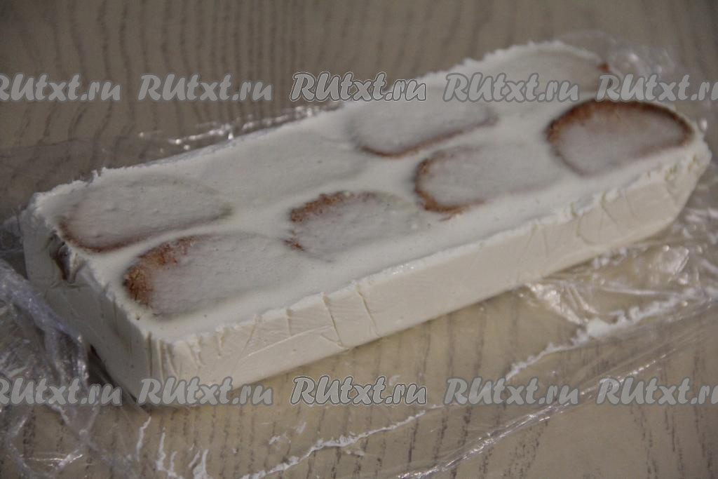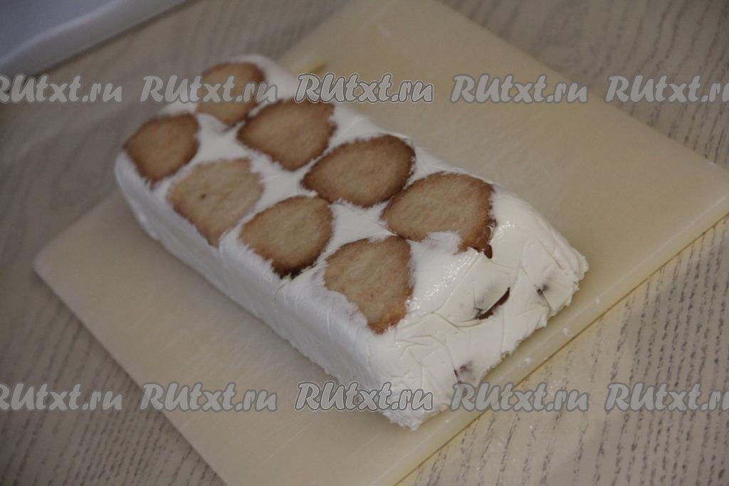 Поставить форму с тортом из сухарей в холодильник на ночь (или до полного застывания). С помощью плёнки достать полностью застывший торт из формы.