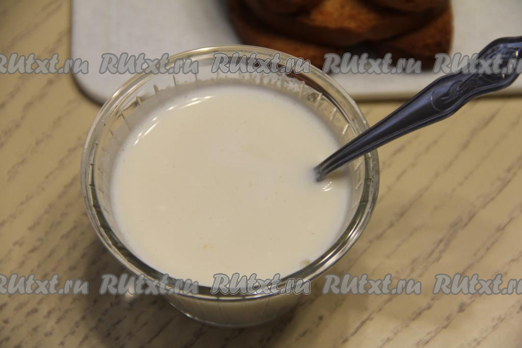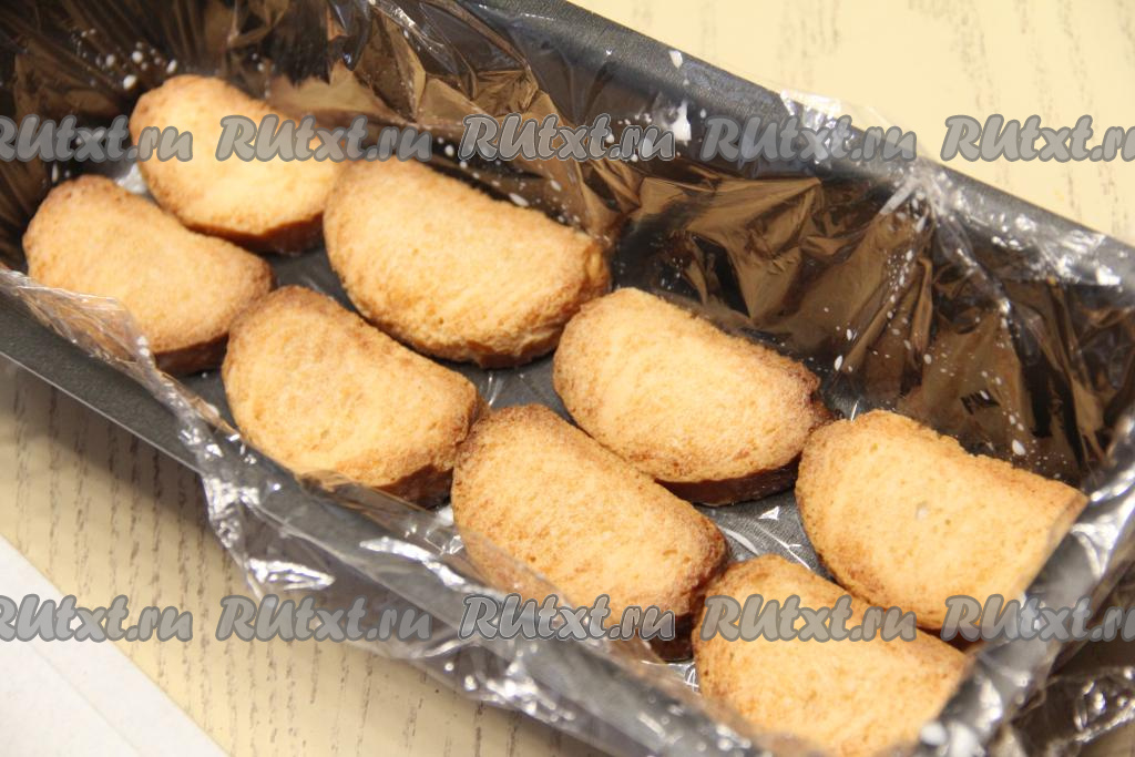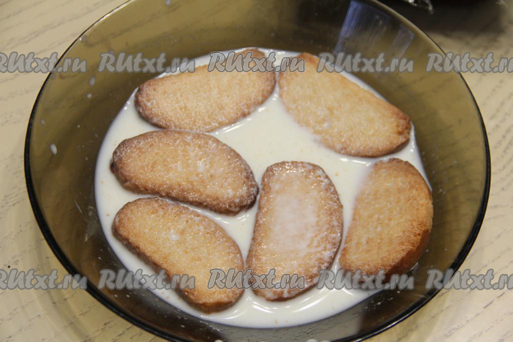 Дно и бока формы, в которой будете формировать торт (я взяла форму размером 11 сантиметров на 30 сантиметров), выстелить плёнкой. В достаточно объёмную миску влить 200 миллилитров молока. Выложить часть сухариков, оставить секунд на 30 (сухарики должны стать достаточно мягкими, но размокнуть и потерять форму они не должны).