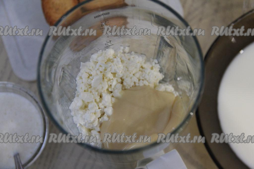 Для приготовления суфле в чаше, удобной для взбивания, соединить творог, 100 миллилитров молока и сгущённое молоко.