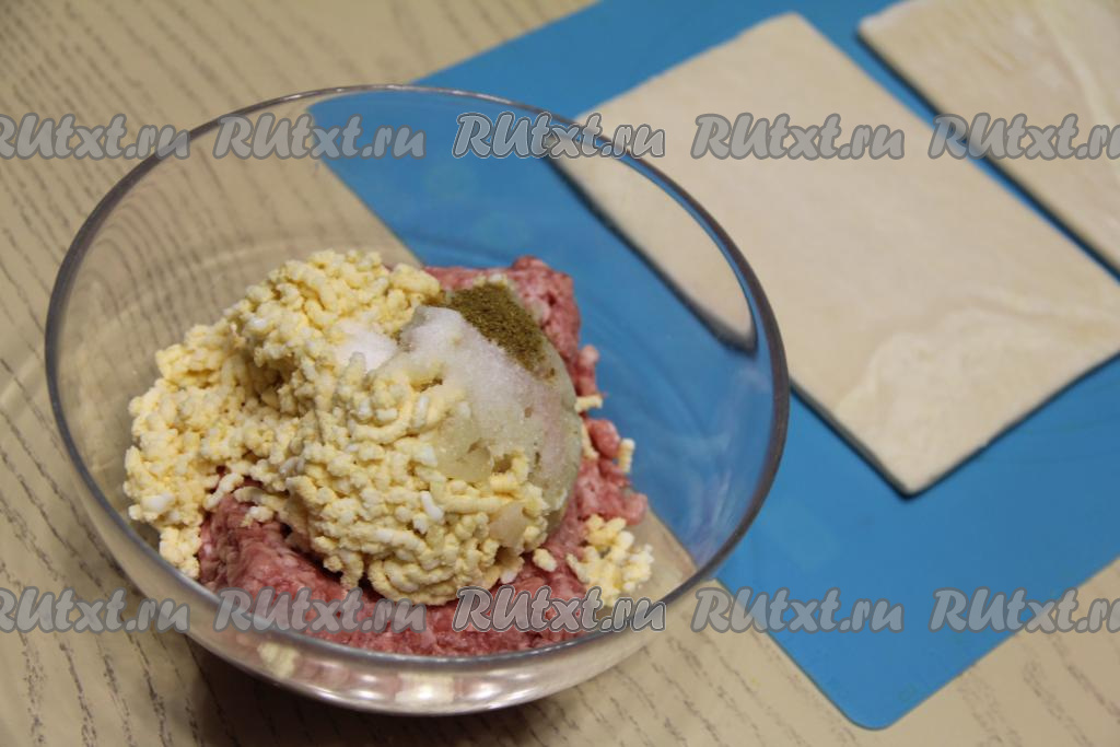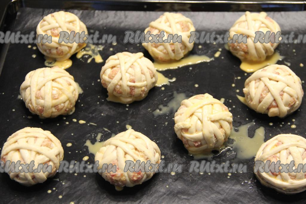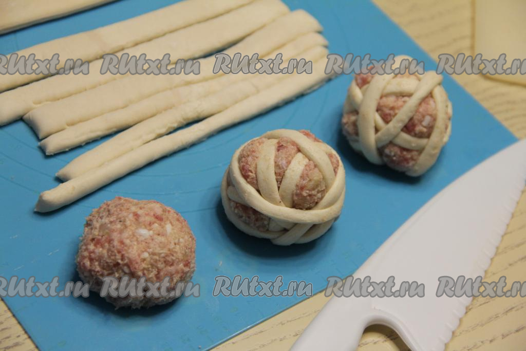 Скатать из каждой части фарша ровный мясной шарик. Каждый шарик из фарша обернуть несколькими полосками слоёного теста, как клубок ниток. Тесто не нужно предварительно раскатывать, просто во время обматывания слегка растягивать его.