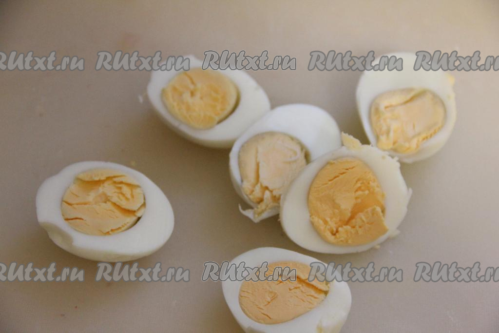 Предварительно сварить 4 яйца вкрутую (в течение 10 минут после закипания воды), затем остудить их и почистить.