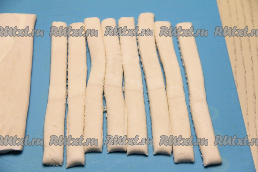 Разморозившееся слоёное тесто на слегка присыпанной мукой поверхности нарезать на полоски шириной примерно 1 сантиметр.