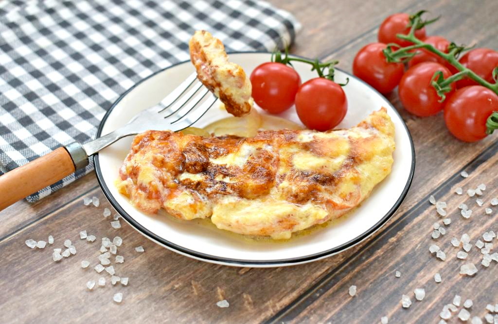 Куриное филе, покрытое помидорами, майонезом и сыром, отправляем запекаться в духовку, прогретую до 190 градусов, на 30-40 минут (ориентируйтесь на свою духовку).