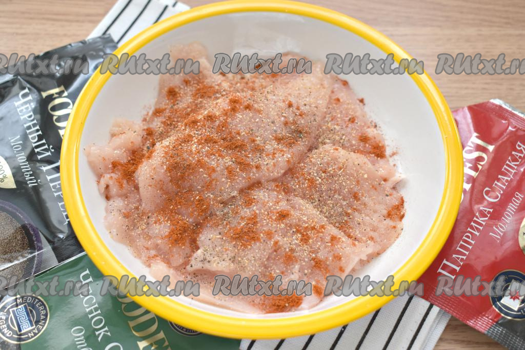 Отбитые кусочки куриного филе перекладываем в миску, по вкусу солим и посыпаем молотыми специями (я использовала паприку, чёрный молотый перец и сушёный чеснок, вы можете взять свои любимые приправы по вкусу). Перемешиваем куриное филе со специями и оставляем мариноваться на 15-30 минут при комнатной температуре.