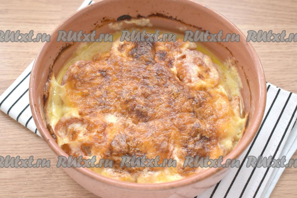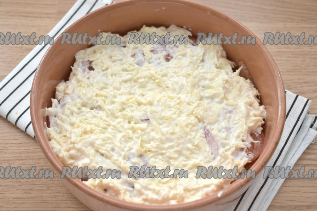 Поверх мяса и помидоров выкладываем смесь сыра и майонеза, разравниваем.
