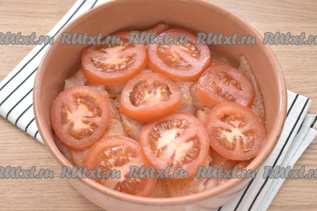 Промываем помидоры, нарезаем на кружочки (или полукружочки) и распределяем их поверх мяса.