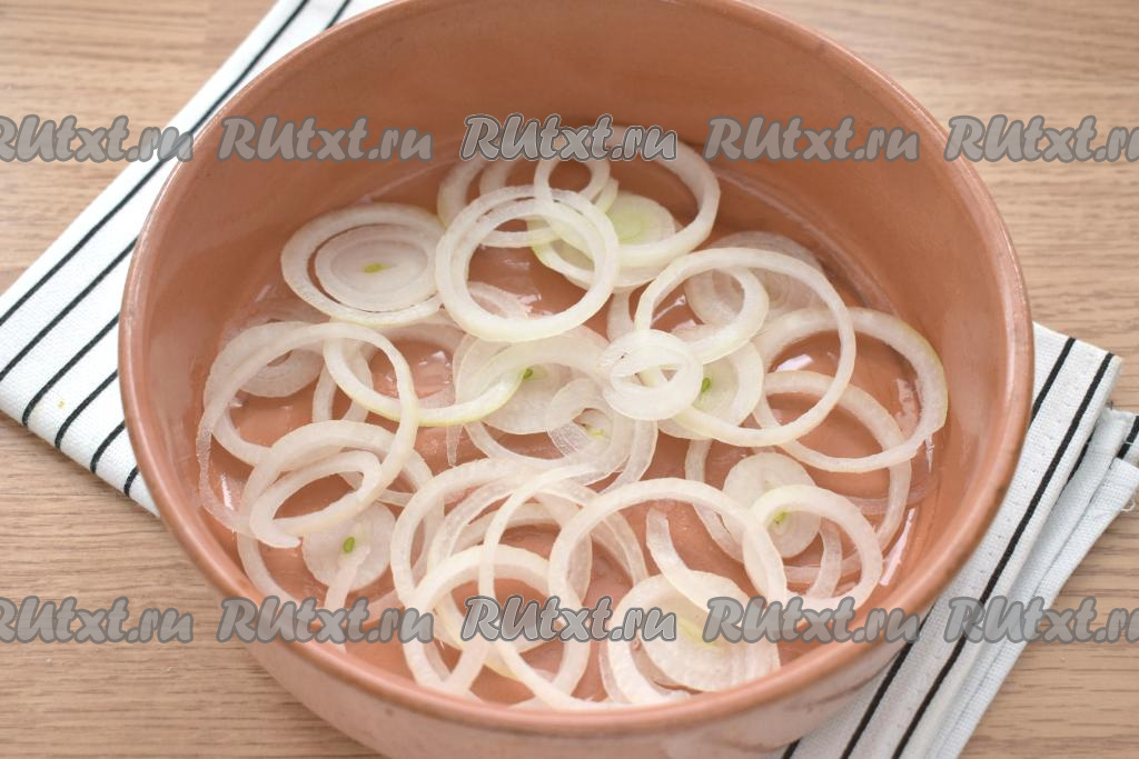 Очищаем репчатый лук и нарезаем его на тонкие колечки. Форму для запекания смазываем растительным маслом, выкладываем колечки лука.