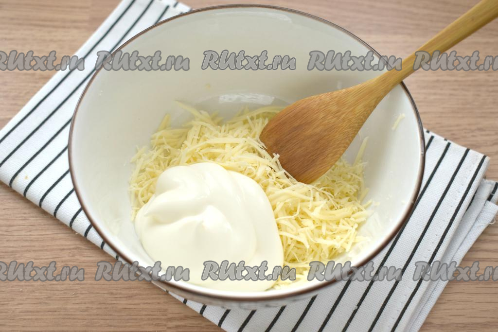 Твёрдый сыр натираем на крупной тёрке в глубокую тарелку, добавляем к нему майонез и перемешиваем.