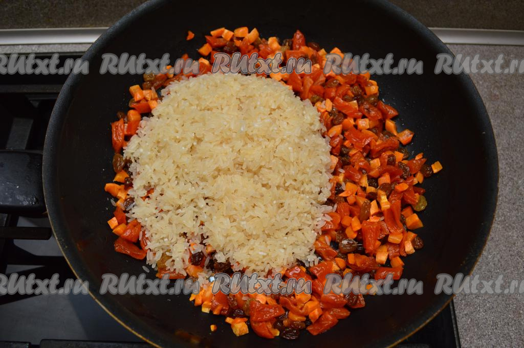Добавить промытый рис в сковороду.