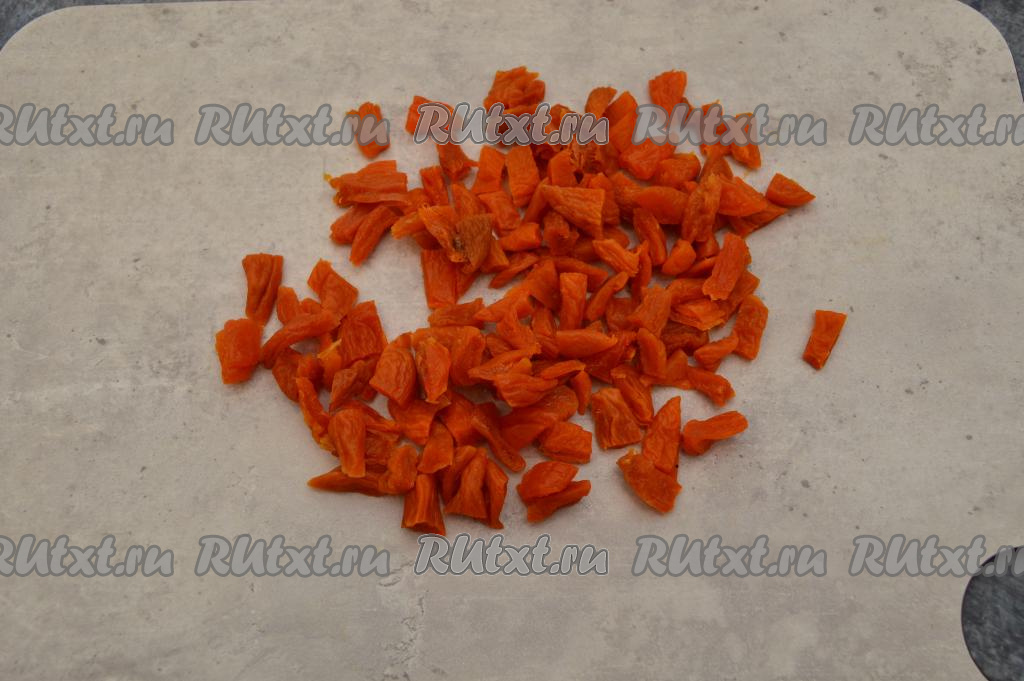 Пока обжаривается морковка, можно нарезать на кусочки курагу.