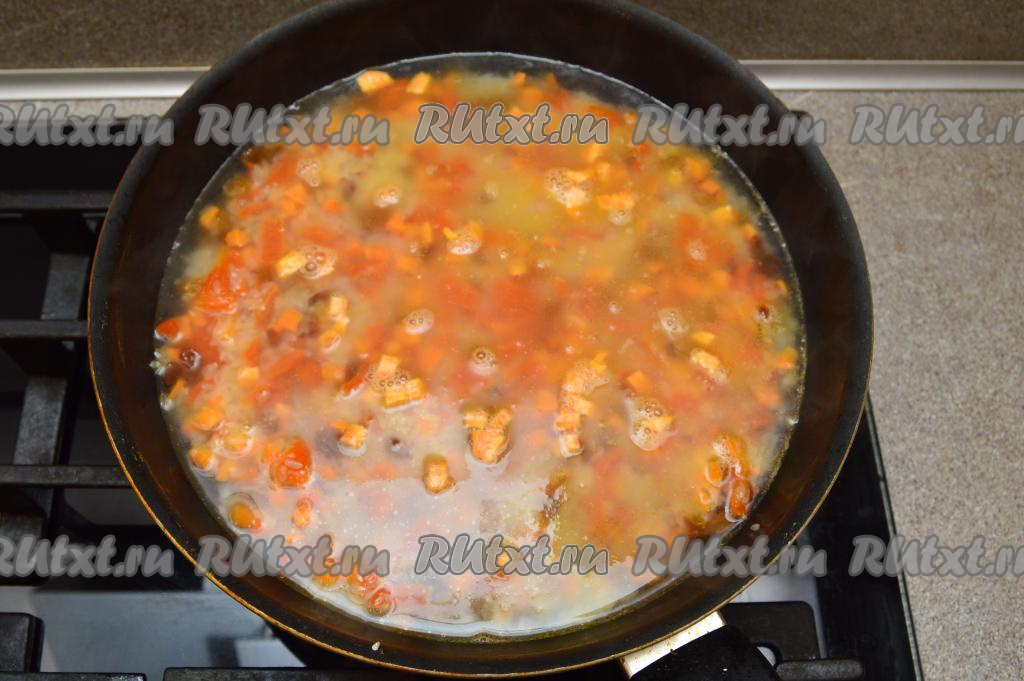 Влить воду комнатной температуры в сковороду (я на 1 стакан риса влила 2,5 стакана воды).