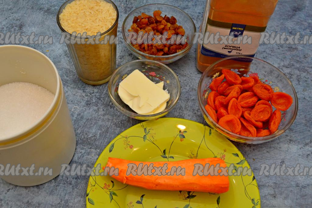 Подготовить продукты. Морковку очистить. Отмерить рис. Рис можно взять любой, я использовала пропаренный. Внимательно осмотрите изюм, если на нём есть веточки, уберите их. Промыть изюм и курагу, дать стечь лишней воде. Запаривать кипятком курагу с рисом не нужно.