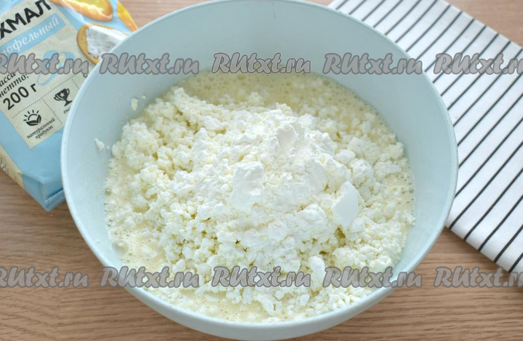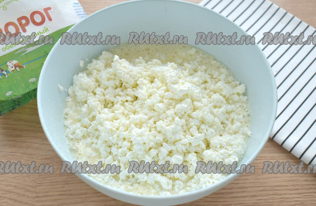 В получившуюся сладкую яичную смесь выкладываем творог.