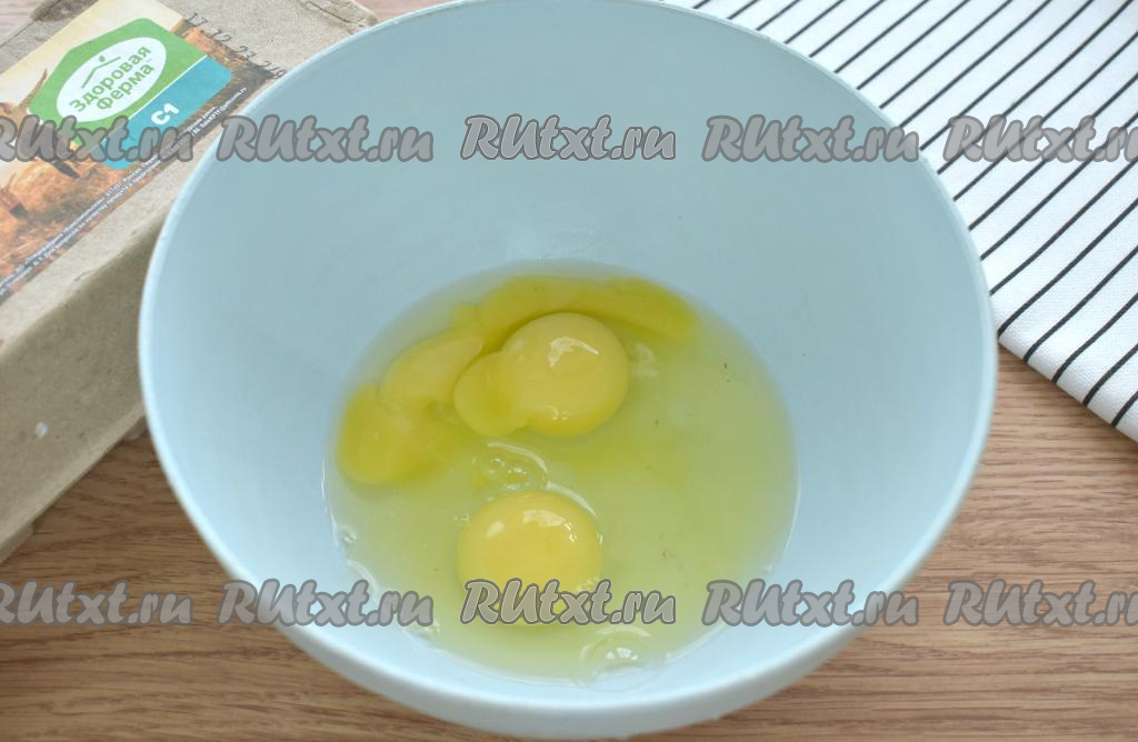 В глубокую миску разбиваем куриные яйца.