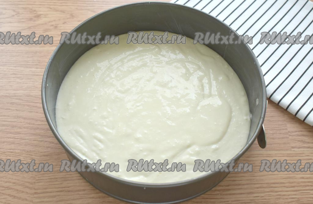 Дно и бока формы для выпечки смазываем сливочным маслом. Переливаем массу из творога и сгущёнки в подготовленную форму для выпечки.