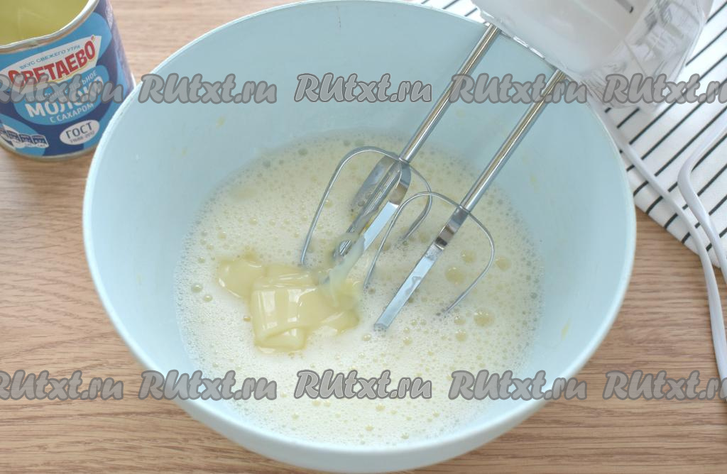 Не переставая взбивать куриные яйца, добавляем к ним сгущённое молоко, взбиваем до однородности.