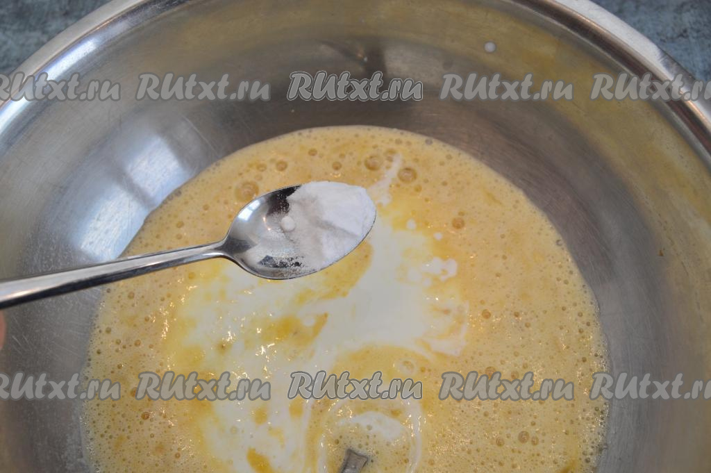 В получившуюся массу влить кефир комнатной температуры, всыпать соду, перемешать до однородности и оставить массу на 3-4 минуты. За это время кефир вступит в реакцию с содой и поверхность кефирно-банановой массы покроется пузырьками.