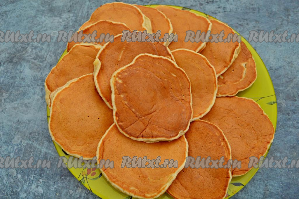 Периодически перемешивая тесто, постепенно пожарить все панкейки, выкладывая их на тарелку горочкой или веером. Всего получилось 14 штук.