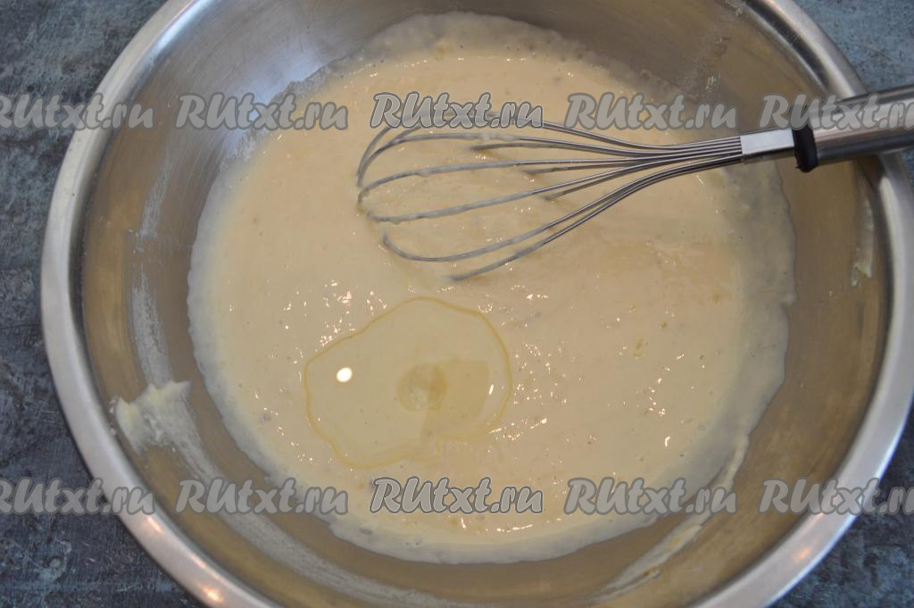 Влить в тесто столовую ложку растительное масла и хорошо вмешать венчиком в тесто.