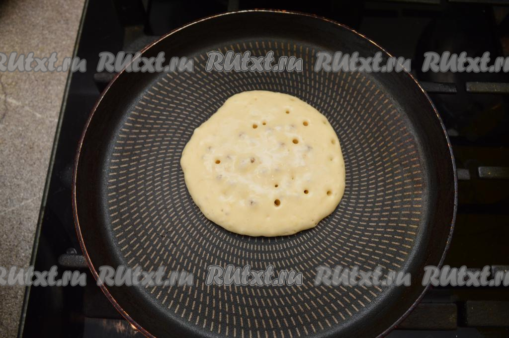 Очень хорошо разогреть сковороду. Панкейки, замешанные на кефире с добавлением банана, обычно жарятся на сухой сковороде (без смазывания сковороды маслом), но многое, конечно, зависит от качества покрытия сковороды. При желании, сковородку можно совсем немного смазать маслом. На хорошо прогревшуюся сковороду выкладывать по 1,5 столовых ложки теста. Как только на поверхности теста начнут образовываться крупные пузырьки, можно переворачивать панкейк.