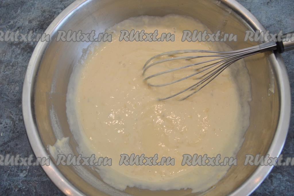 Далее добавлять по 1 столовой ложке муки, постоянно вмешивая её в тесто. Всыпая и вмешивая частями муку, учитывайте, что тесто для панкейков должно напоминать достаточно густую сметану. Тесто должно медленно стекать с ложки. Как только добились нужной густоты теста, значит больше не нужно добавлять муку.