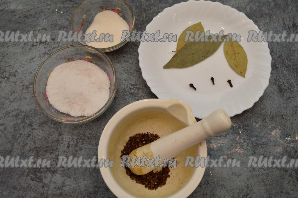 Растолочь ступкой горошины перцев. Нам потребуется примерно 1 чайная ложка перемолотых перцев. Подготовить 3 лавровых листа и 3 бутона гвоздики.