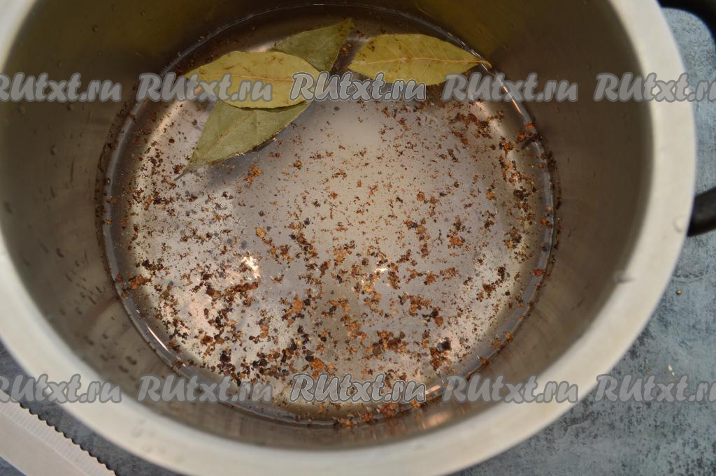 После закипания, периодически помешивая, проварить пряный рассол на небольшом огне 2 минуты, чтобы кристаллы сахара и соли растворились. Затем снять с огня, оставить рассол остывать до тёплого состояния (градусов до 40).