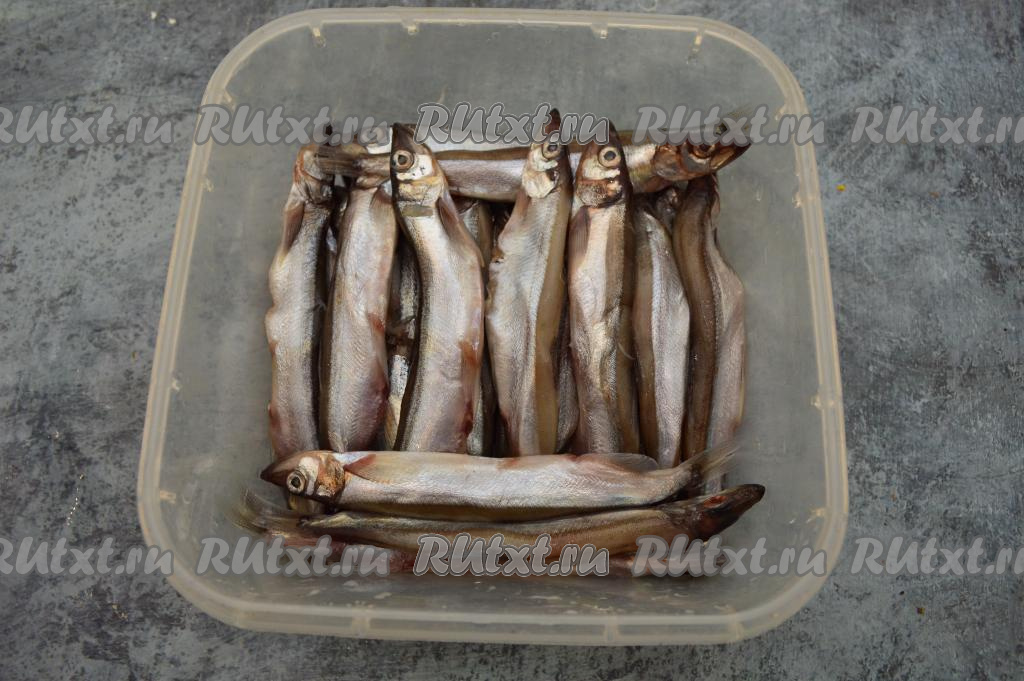Мойву промыть водой, чистить от внутренностей на этом этапе не нужно. Подготовленную мойву сложить в подходящий контейнер.