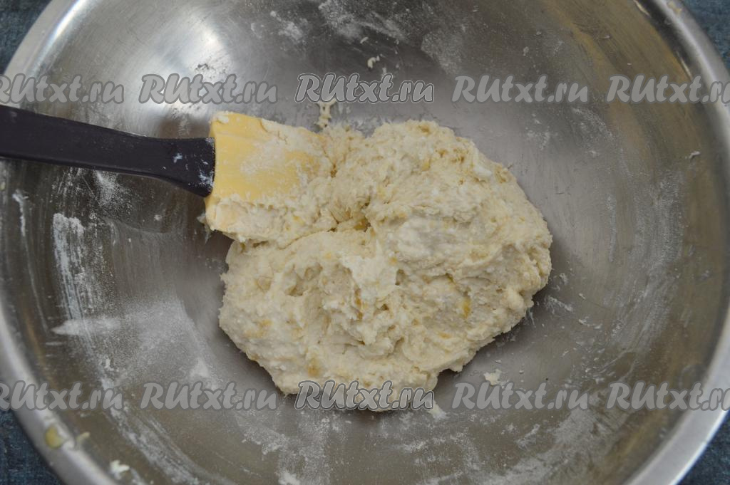 Вмешать муку в творожно-банановое тесто. Нам нужно добиться, чтобы тесто для сырников получилось вязким и липнущим, оно будет держать форму, если сформировать из него сырник. В зависимости от влажности творога, возможно, придётся добавить ещё муку. Для получения творожно-бананового теста нужной консистенции в общей сложности я добавила 2,5 столовых ложки (примерно 60 грамм) муки.