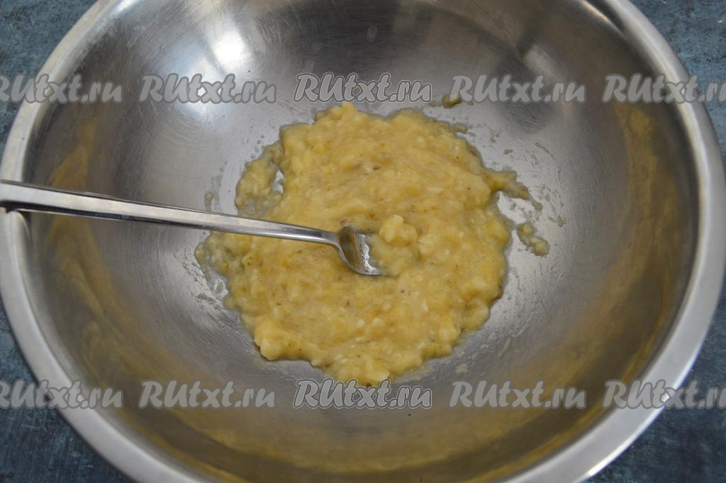 Банан очистить от кожуры, поломать на кусочки, выложить в миску и размять вилкой до получения однородного пюре. Чем крупнее и слаще будет банан, тем более сладкими получатся сырники.