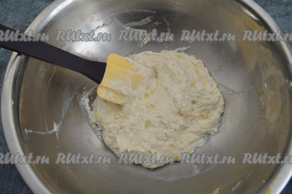 Всыпать в творожно-банановую массу 2 столовых ложки муки.