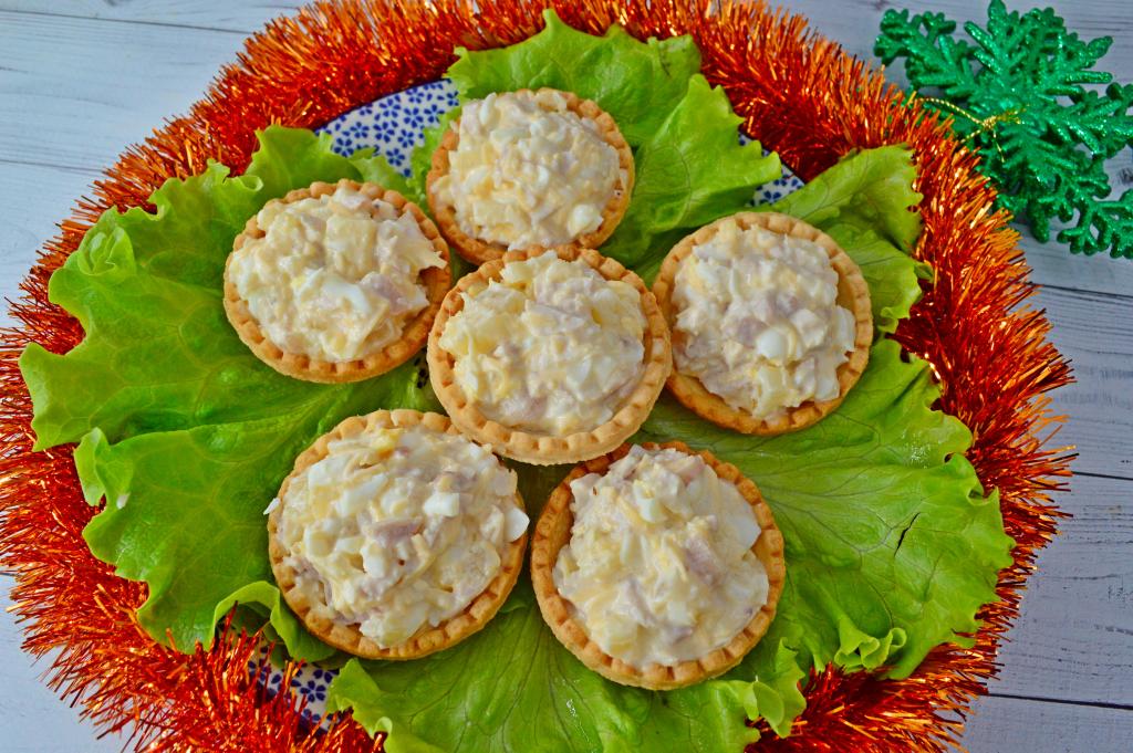 Непосредственно перед подачей наполнить тарталетки салатом. Я взяла песочные несладкие тарталетки диаметром 6 сантиметров.