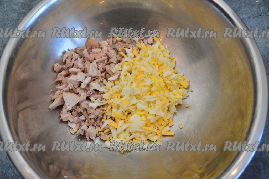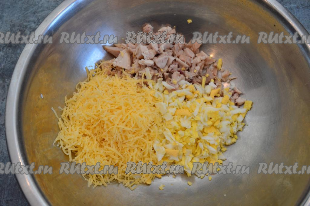 Варёному мясу и яйцам дать полностью остыть. Куриное филе нарезать на небольшие кусочки. Яйца очистить и натереть на крупной тёрке. Сложить натёртые яйца и нарезанную курицу в глубокую миску.