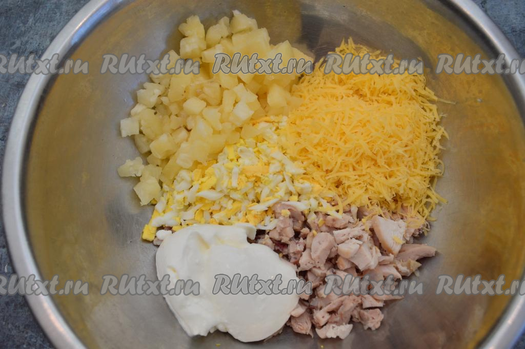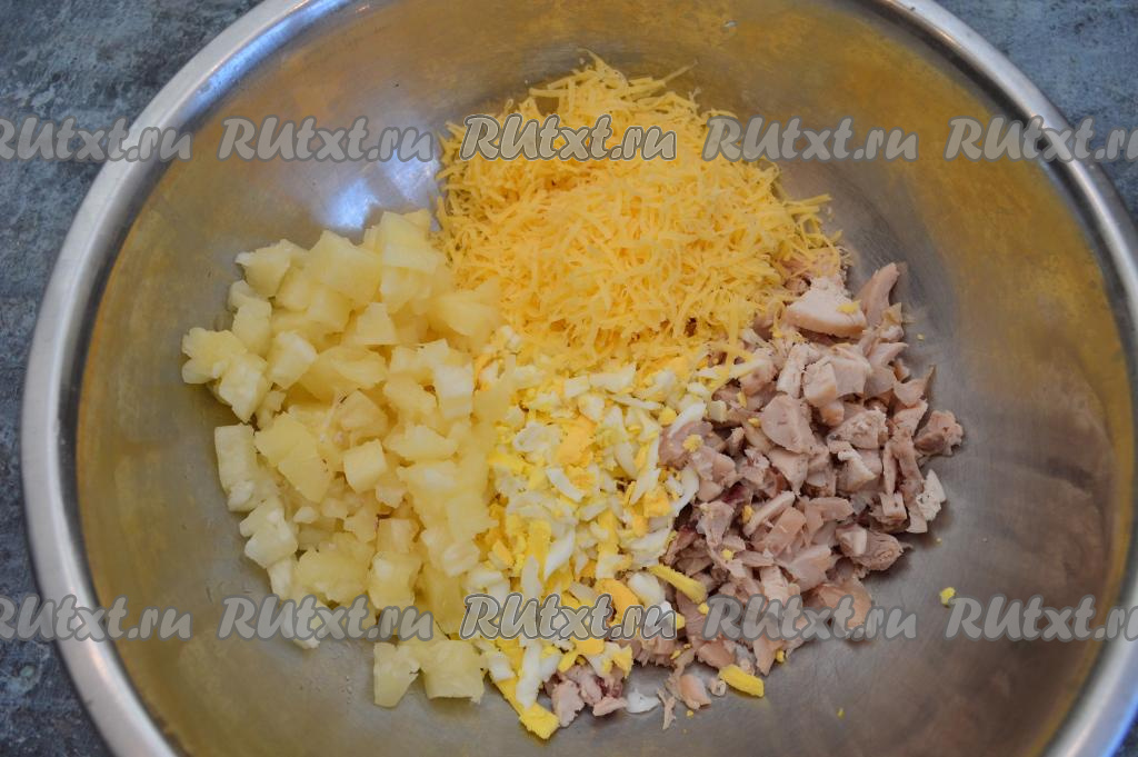 Салат из курицы, сыра, ананасов и яиц посолить по вкусу. Если вы готовите салат часа за 2-3 до подачи, то до подачи поставьте его в холодильник.