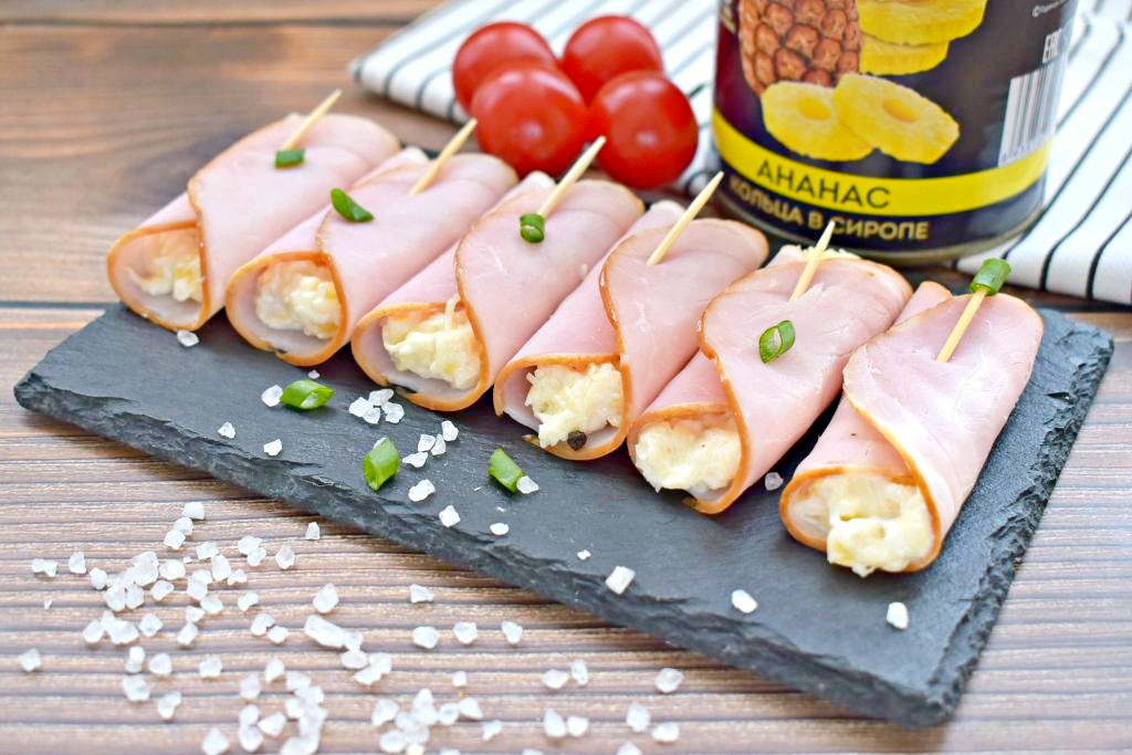 Предлагаю в качестве вкусной и пикантной закуски приготовить на праздничное застолье рулетики из ветчины с начинкой из сыра и консервированного ананаса. Готовятся такие рулетики и просто, и быстро, а получаются очень удачными. Ананас добавляет сладкую нотку начинке, освежая вкус и создавая интересный контраст с сыром и ветчиной. Просто, оригинально и вкусно!