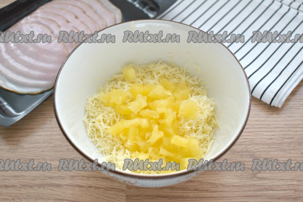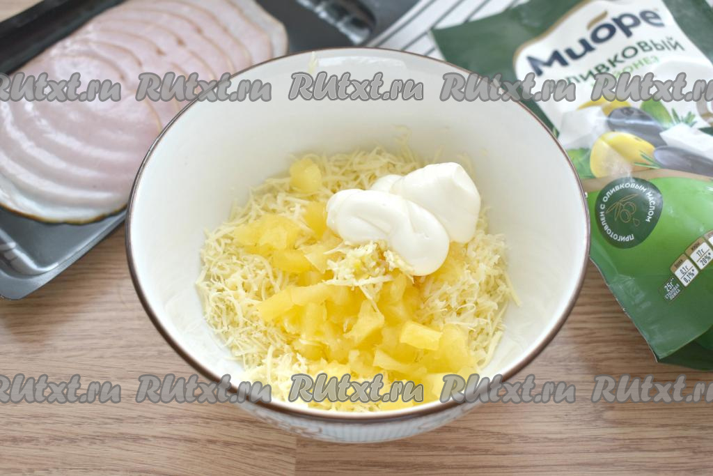 К сыру добавляем консервированные ананасы без жидкости, нарезанные на маленькие кубики.